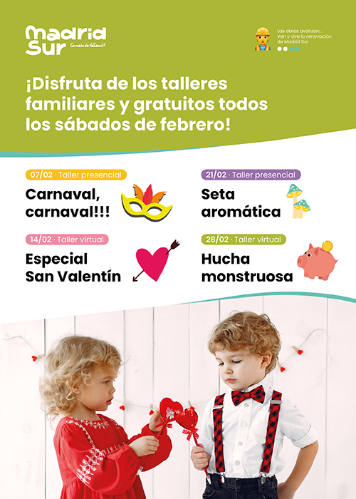¡Ya están aquí los talleres creativos de febrero! ¡Ven y disfruta de una tarde divertida con tu familia en Madrid Sur! ¡Es gratis!